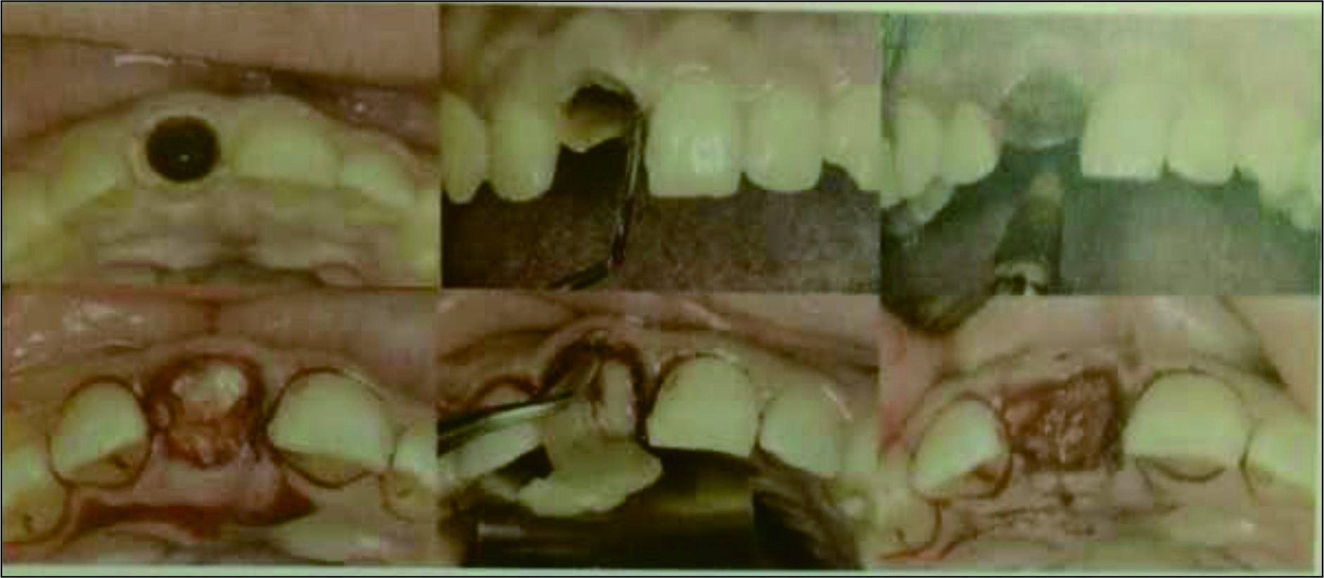拔牙8周后进行种植体植入术,保留牙龈乳头切口,翻瓣,可见已有部分唇侧骨板吸收,形成三壁骨缺损,丰满度下降,拔牙窝中间仍有部分空虚,在种植体植入的合适位置3.0环钻取骨,样本送组织切片观察,在取骨区骨挤压后植入士卓曼3.3x13mmNC(士卓曼,Switzerland)种植体一枚,扭力15N.cm,唇侧使用CGF混合BIo-Oss骨粉(Geistlich,Switzerland)过量植骨增加丰满度,上方覆盖Bio-Guide可吸收膜(Geistlich,Switzerland),减张缝合。手术图步骤详见图4-6,